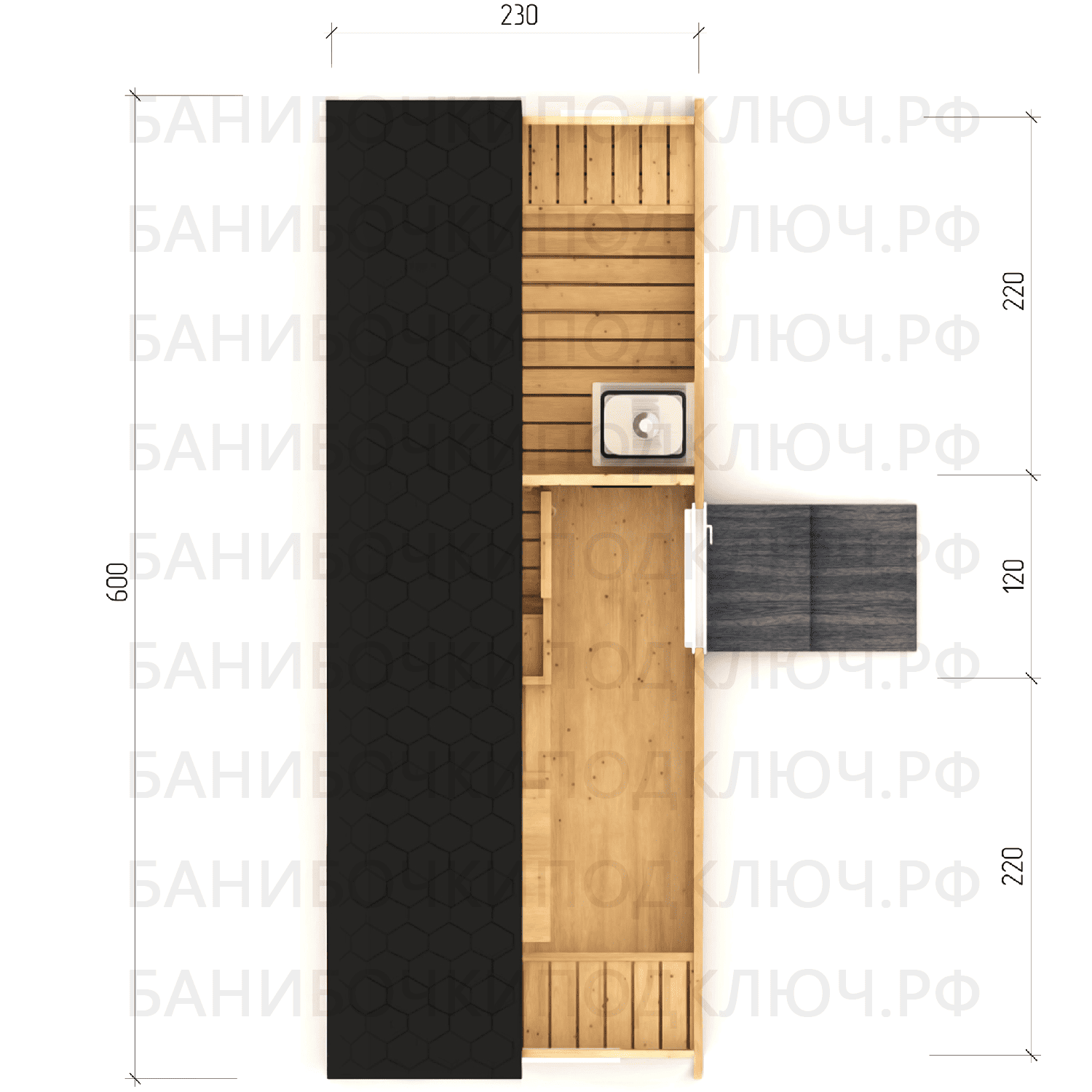 комната отдыха – 200х300, парная 180х220, мойка 120х220